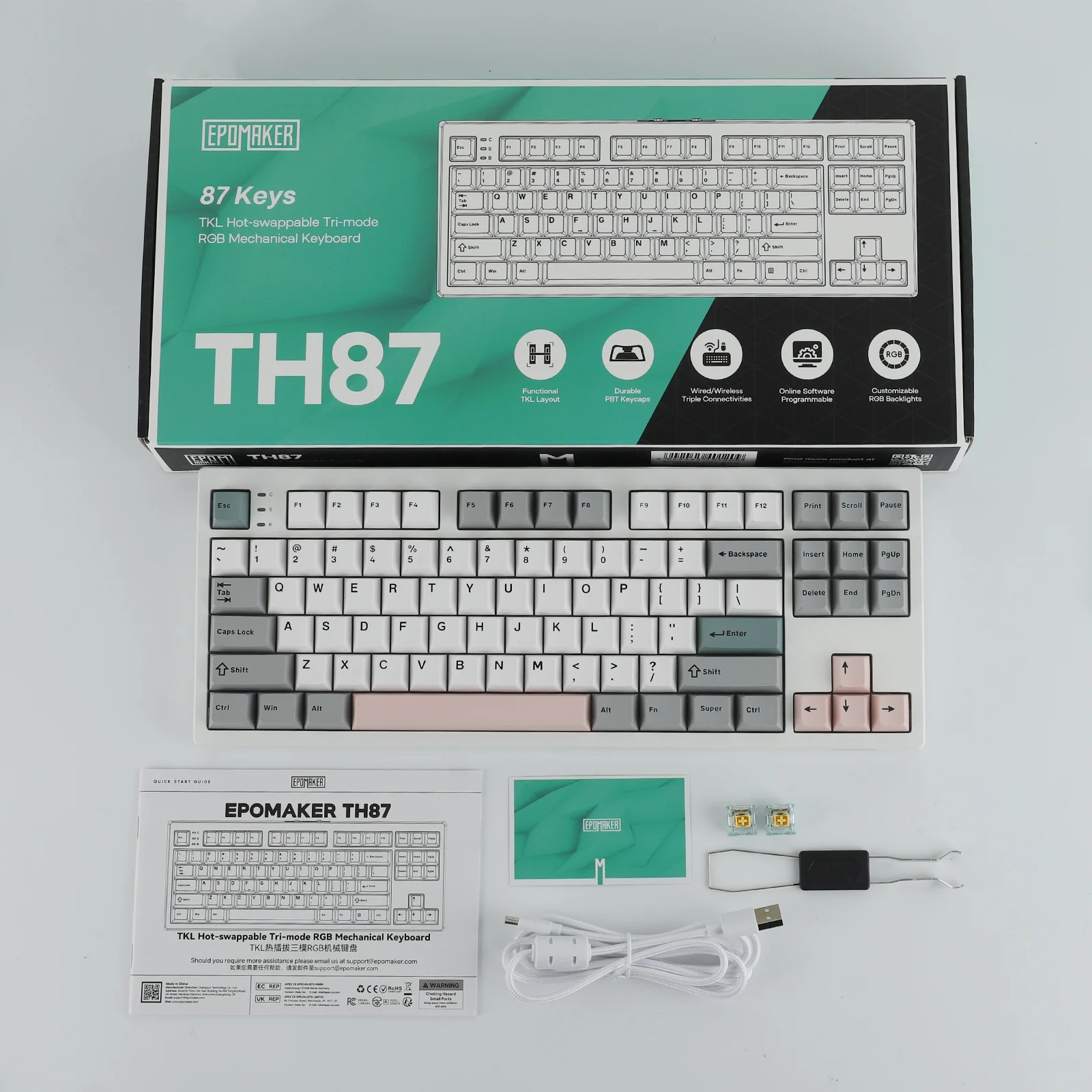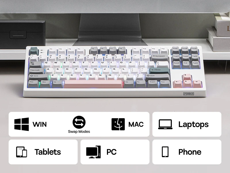 Featuring the compact tenkeyless layout, the TH87 TKL keyboard preserves all essential keys in a standard key map with comfortable spacing, for hassle-free transition from a full-sized layout, while reclaiming space for sweeping your mouse. Functional and stylish, this 87-key gaming keyboard is clean, crisp, and architectural with cool gray, soft teal, and light blush. Whether you're using it to crush deadlines in a sleek professional office or streaming your latest victory from your home battle station, the EPOMAKER TH87 will blend in elegantly while still making a stylish statement.