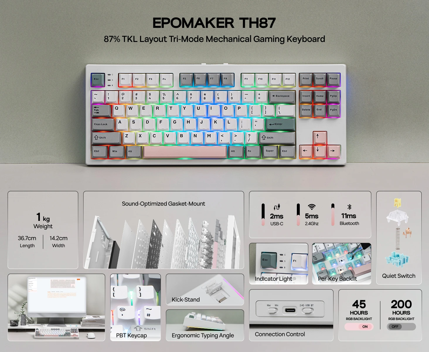 EPOMAKER TH87 TKL US ANSI Layout Gasket Wired/Bluetooth/2.4Ghz Wireless Mechanical Gaming Keyboard with 10000mAh Battery