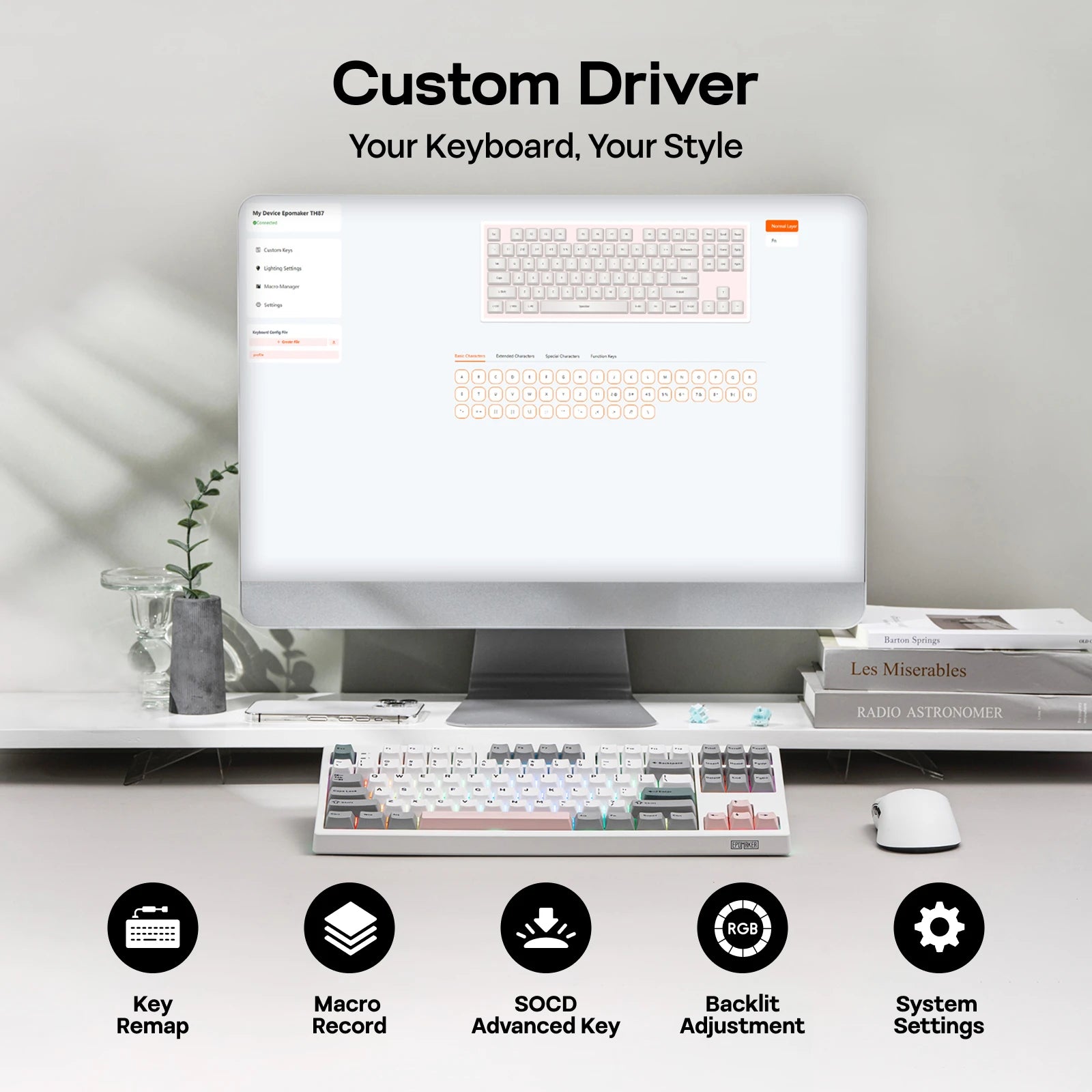 Embrace total control with the TH87 custom keyboard, ideal for gamers who demand performance and flexibility. The pre-lubed, smooth switches offer a fantastic, consistent typing with no modification required, while the hot-swappable PCB streamline the switch-swap experience for easy customization. Assign a complex key sequence to a single macro key, or remap rarely used keys to essential shortcuts, with Chrome-based software accessible online and offline on Mac/WIN, the TH87 custom keyboard is a perfectly tailored extension of your workflow, for a decisive edge in any task.