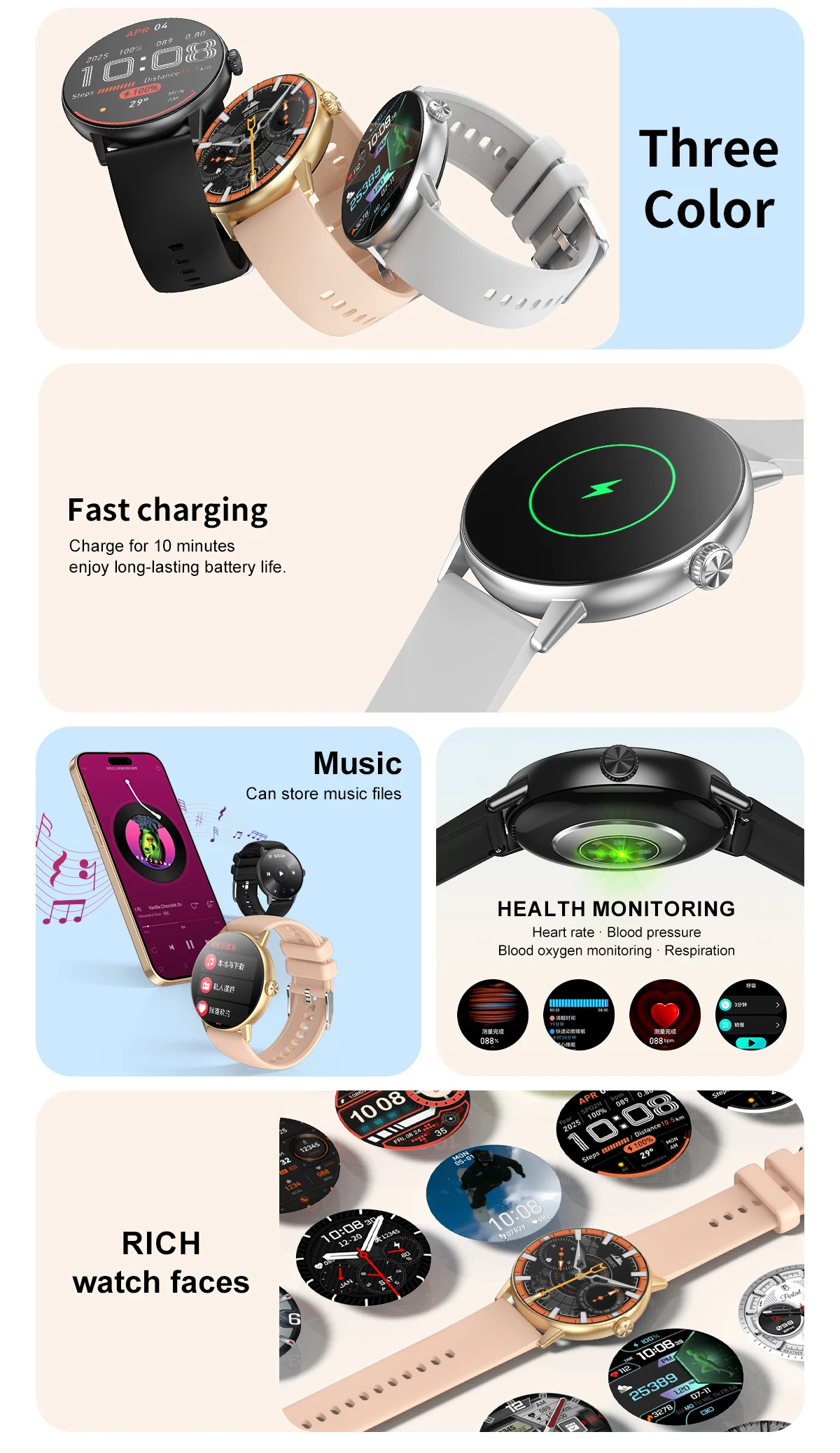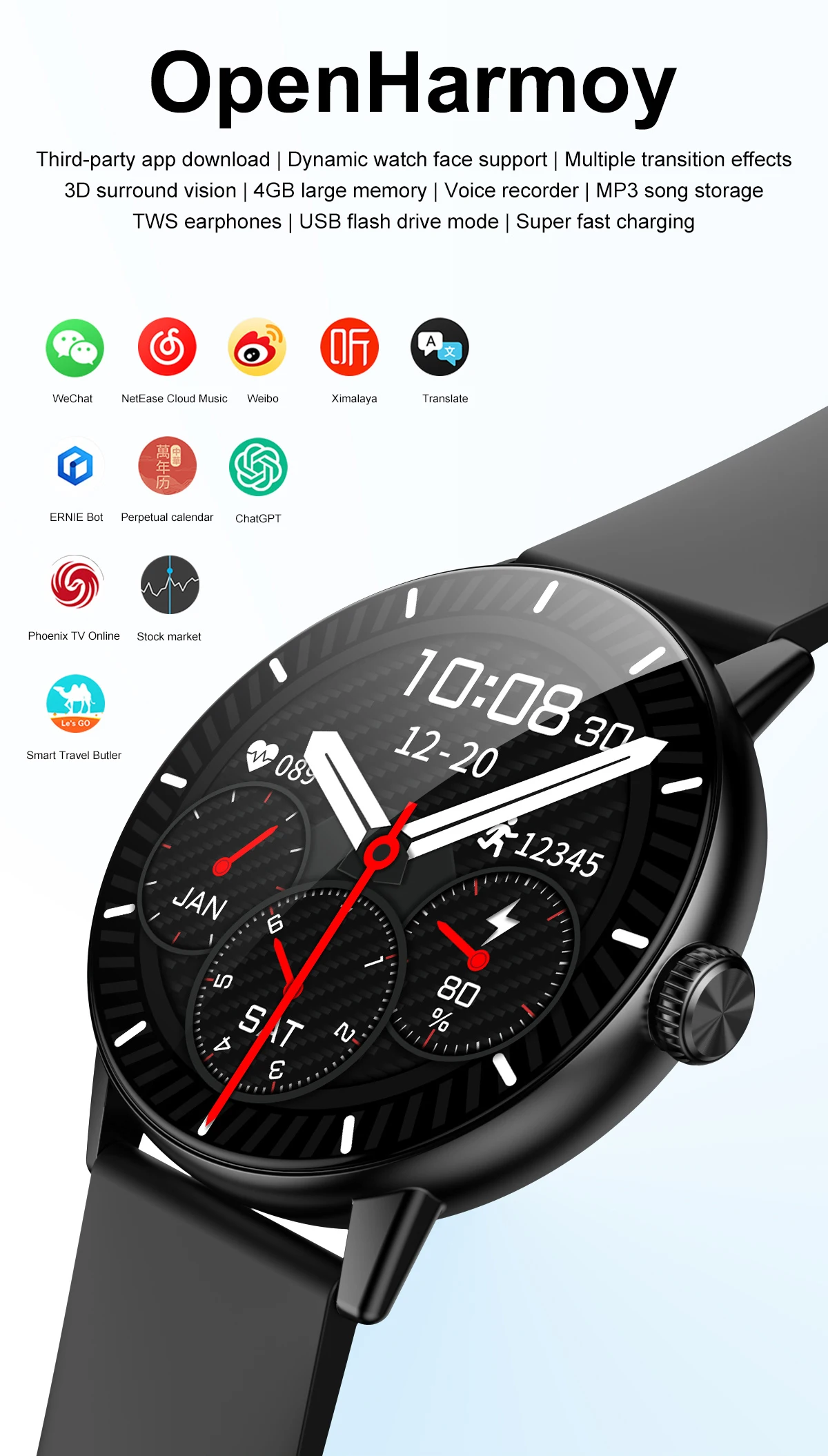 Function: Passometer,sleep tracker,Message Reminder,Answer Call,Dial Call,Push Message,24 hour instruction,Alarm Clock,World Time,Calorie Counter,Permanent Calendar,Power Reserve,Heart Rate Tracker,Interactive Music,Noctilucent,Calendar,Compass,Countdown,Calculators